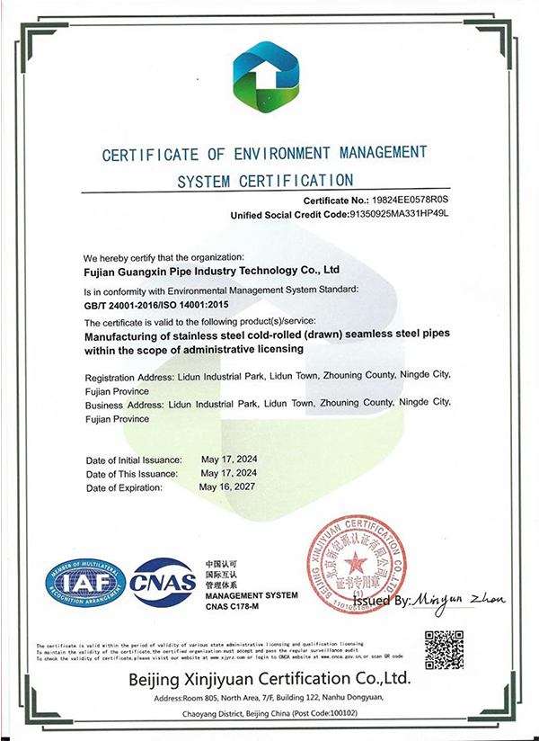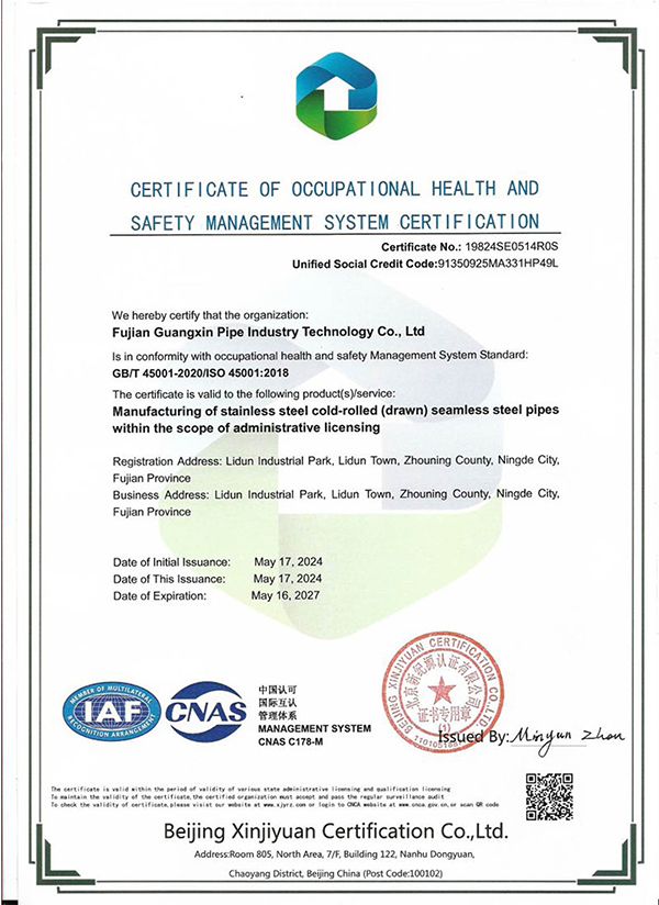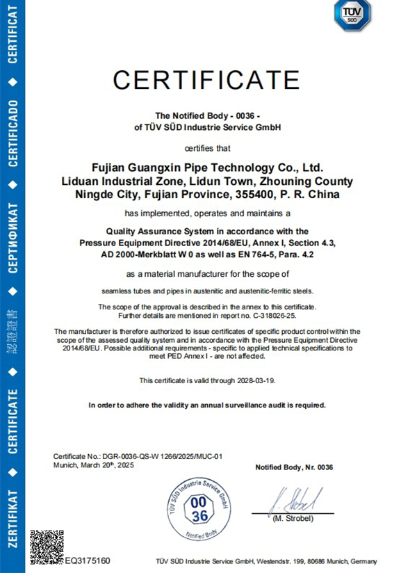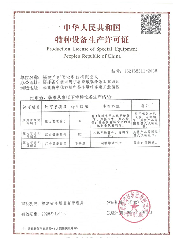 Fujian Guangxin PipeTech Co., Ltd. operates five major production workshops and is equipped with over 50 sets of manufacturing and testing equipment, employing 180 staff members. The company specializes in stainless steel seamless pipes, welded pipes, elbows, and flanges made from 304, 316, duplex stainless steel, and nickel alloy materials. With an annual production capacity exceeding 8,000 tons, Guangxin ensures product quality through advanced testing methods including spectroscopic analysis, eddy current testing, and hydrostatic testing. Strictly adhering to ISO 9001 and PED standards, the company has earned widespread trust and praise from domestic and international clients.